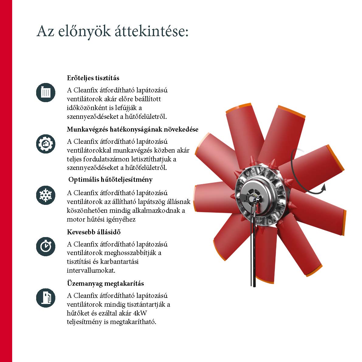 A CLEANFIX ventilátorok utólag is beépíthetők egyedileg minden alkalmazási területre. Amennyiben az Ön géptípusához még nincs Cleanfix ventilátor adaptáció, akkor egy méretezési adatlapot kitöltve a szükséges méretekkel és azt eljuttatva hozzánk a gyártó megtervezi az ön gépéhez legmegfelelőbb ventilátort, megoldva így a hűtési problémákat. Szinte minden területen használható: mezőgazdaság, erdőgazdaság, építőipar, bányaipar, vasúti közlekedés, hulladék gazdálkodás, stb...