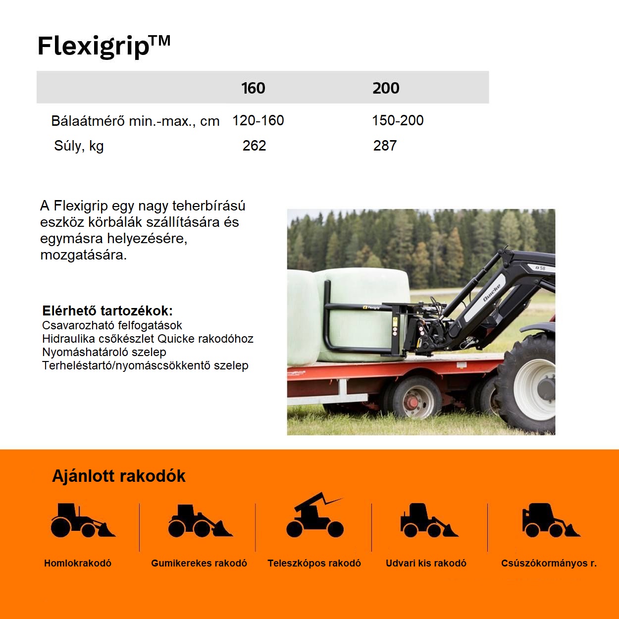 A Flexigrip karok nagy teherbírású csapokra vannak felszerelve, amelyek cserélhető perselyekkel rendelkeznek. Reteszelheti a bal vagy a jobb munkaeszközt kart is, de még mindig van némi mozgás, és ez lehetővé teszi a bálák szoros egymásra rakását anélkül, hogy megsértené a bála körüli fóliát. A munkaeszköz karok is úgy vannak megtervezve, hogy könnyen elfordíthatóak legyenek a bálától, és ez előnyt jelent, ha a bálákat szorosan kell egymásra rakni. Az egyedülállóan ívelt és lekerekített formák, valamint a 90 mm-es csövek nagyban hozzájárulnak mind a fekvő, mind az álló bálák nagyon óvatos kezeléséhez. Külön kiemelendőek a hosszú, ívelt csövek, amelyek egy darabból vannak kialakítva, éles szélek és hegesztett kötések nélkül. A cső felső meghosszabbítása egy speciális tulajdonság, amely jobb alátámasztást biztosít a fekvő bálák kezelésekor. Ha a bálákat függőlegesen, egymás fölött tárolják, csökkenti annak kockázatát, hogy levegő és nedvesség kerüljön a bálákba, a Flexigrip tökéletes az álló bálák egymásra helyezésére.