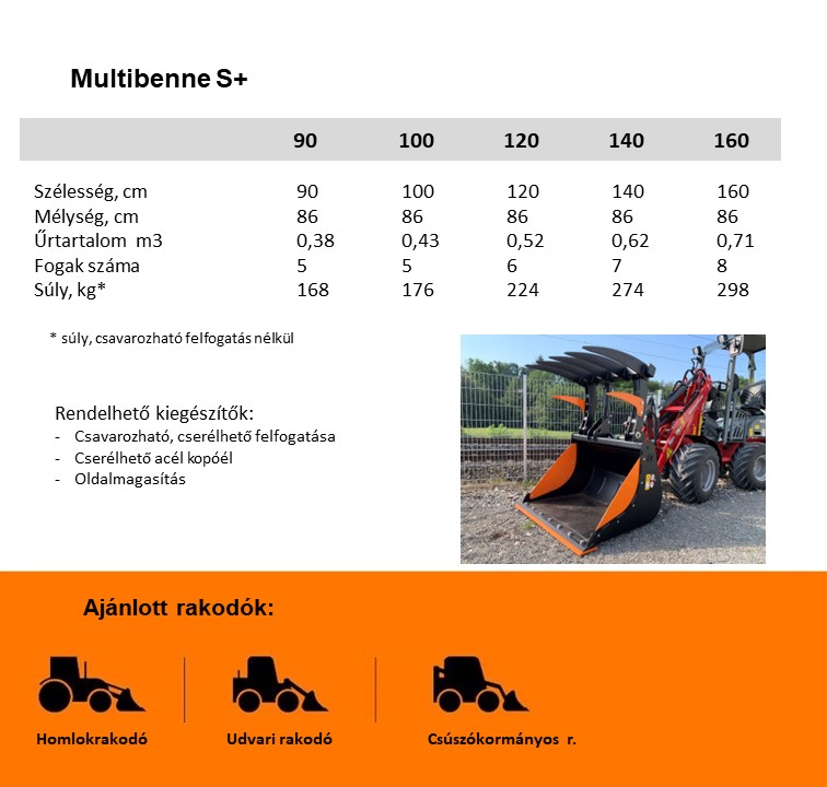 • Kicsi, erős kialakítású és felépítésű, hosszú élettartamot garantál • Ideális udvari rakodógépekhez és kisméretű kompakt kerekes rakodógépekhez • Különféle tartozékokkal kapható