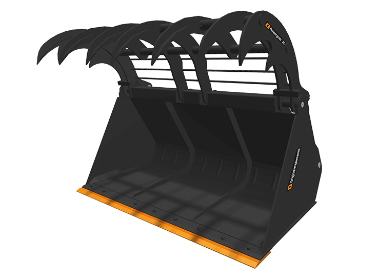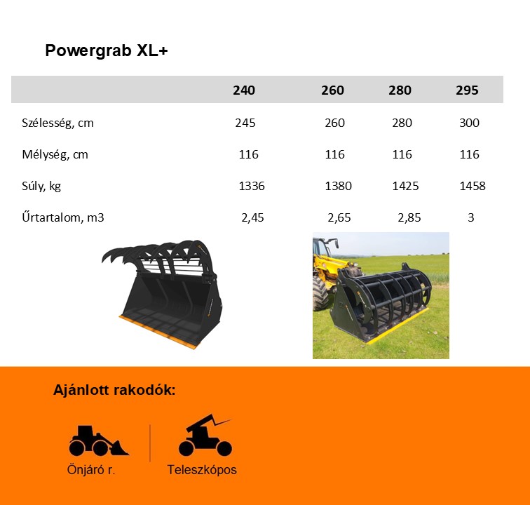 Szilázs takarmány megfogására és mozgatására, 3 – 5 tonnás emelőkapacitású rakodógépekhez. A Powergrab XL edzett acél palástjának köszönhetően csökkent a súly/szilárdság aránya. A Powergrab XL alapfelszereltsége a vágóélhez csavarozható kopóél. Az paláston hegesztett merevítések vannak, amelyek erősítik a vágóél rögzítését. A kanál belső része egy lekerekített hátsó betétet tartalmaz. Ez egy üreges részt hoz létre a kanál hátsó részén, amely javítja a torziós merevséget, miközben javítja a formát az anyag könnyű kilökődése érdekében. A kanál hátulján egy sínrendszer található, amely a felfogatás rögzítésére szolgál.
