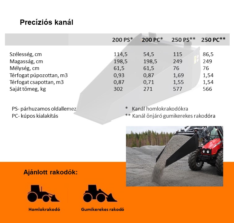 A precíziós kanalakat úgy tervezték, hogy az anyag ürítése könnyebben ellenőrizhető legyen a kanálból. A kanál hosszú alsó része súrlódik a talajon, ezáltal lassul az ürítés, és ez sokkal pontosabbá teszi a kezelőt. Kétféle változatban kapható: párhuzamos olalakkal és kúpos formájú.
