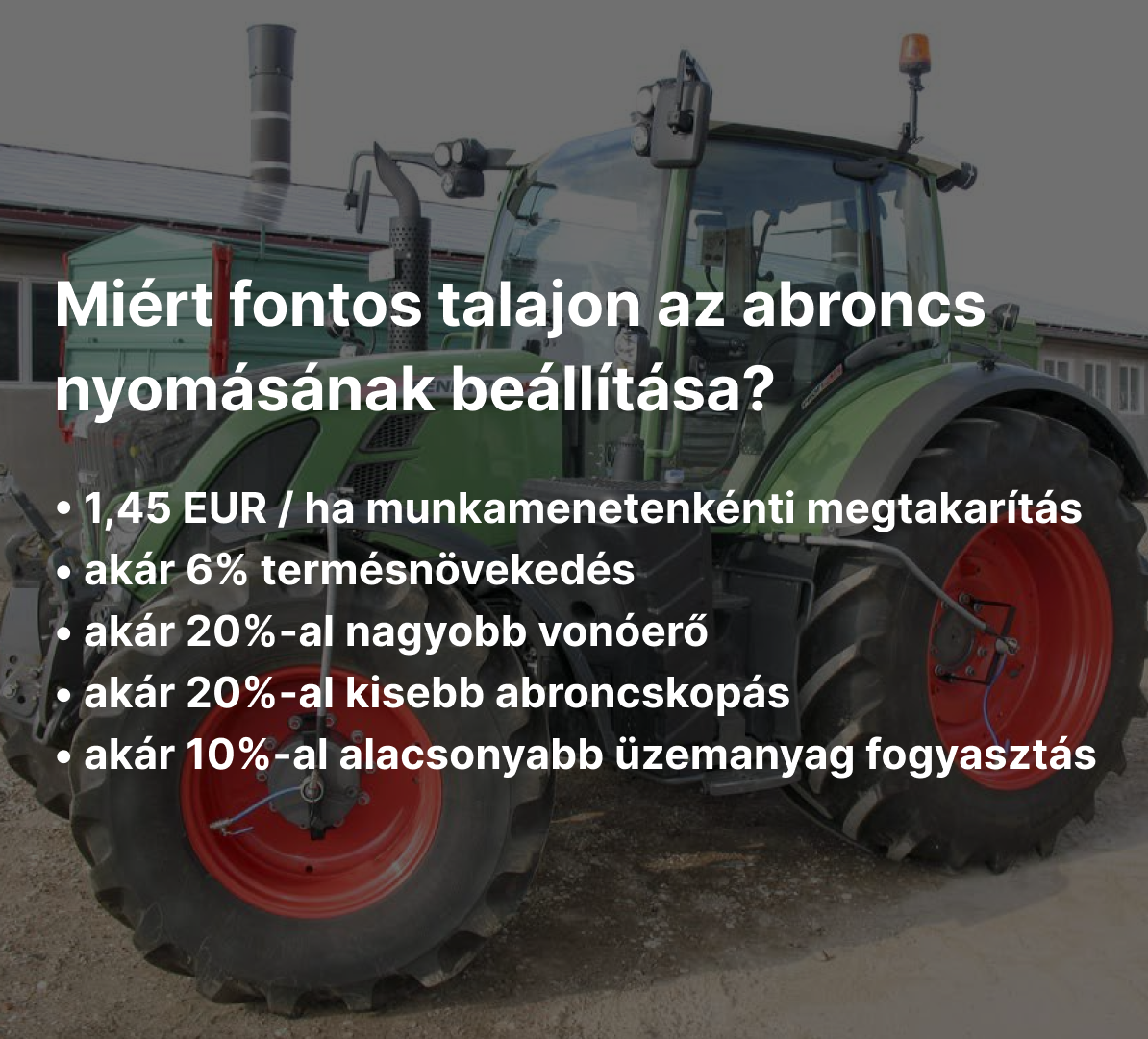 • Az abroncsnyomás csökkentésével a szántóföldön az abroncs erősebb belapulása és közel 100%-kal nagyobb felfekvő felület növekedése érhető el • A talajnyomás ezáltal jelentősen csökken és a nyommélység akár 50%-kal is csökkenhet • A laposabb nyomvályúk a gyökérzet számára jobb átjárhatóságot biztosítanak, így ezeken a felületeken akár 6%-kal nagyobb termésátlag érhető el • A nagyobb felfekvő felületnek köszönhetően több profilborda kapaszkodik a talajba; a vonóerő akár 20%-kal, a területteljesítmény akár 10%-kal is növekedhet, egyidejűleg az üzemanyag fogyasztás 15%-kal való csökkenése is elérhető • Mindemellett a csökkentette abroncsnyomás jelentősen puhább, ember-, és gépkímélő közlekedést eredményez a szántóföldön (50%-kal kevesebb lengés) • Az elvégzett talajmunkát követően az abroncsok ismét gyorsan a közúti abroncsnyomásra fújathatók, így biztosítva a szükséges közlekedésbiztonságot. • A magasabb közúti abroncsnyomás ezen kívül az üzemanyag fogyasztást (-5%) és a gumikopást (-20%) is csökkenti *Forrás: LU Mitgliederinfo 2003, Dr. Weibach, Uni Kiel