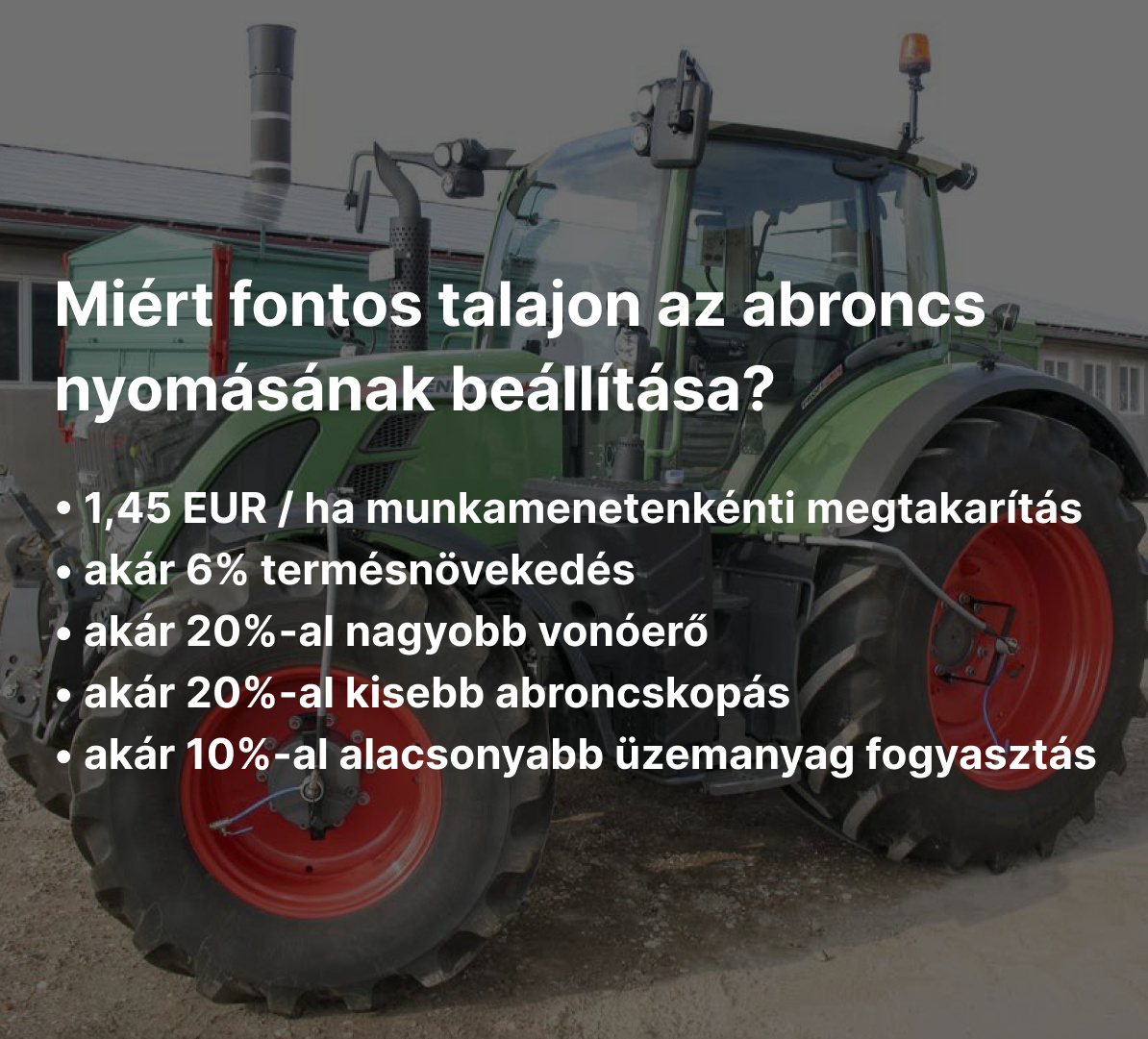 A beállítható abroncsnyomás a szántóföldi munkákhoz és a közúti közlekedéshez egyetlen gombnyomással előhívható majd beállítható minden csatlakoztatott kerékre 0,1 bar-os lépcsőkben. A rendszer aktiválása után a kiválasztott gumiabroncs-nyomás értékek automatikusan beállítódnak az összes kerékbe, ezt követően a rendszer újra kikapcsol. A rendszert természetesen bármikor deaktiválhatjuk egy gomb megnyomásával is.