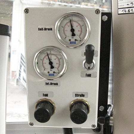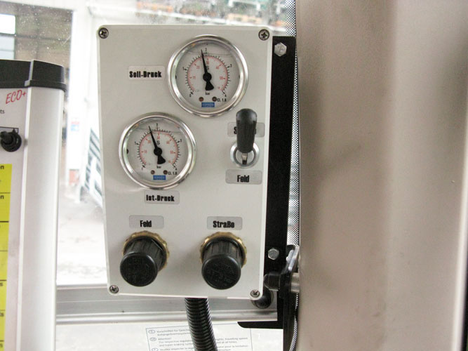 A gépkezelő előre kiválasztja a szükséges szántóföldi és közúti abroncsnyomást a kezelőegységen (fokozatmentes beállítás). A váltókar segítségével egyetlen mozdulattal válthat a két előre kiválasztott nyomástartomány között. A vezérlés azonnal elkezdi beállítani ezt az értéket az összes csatlakoztatott gumiabroncsban.