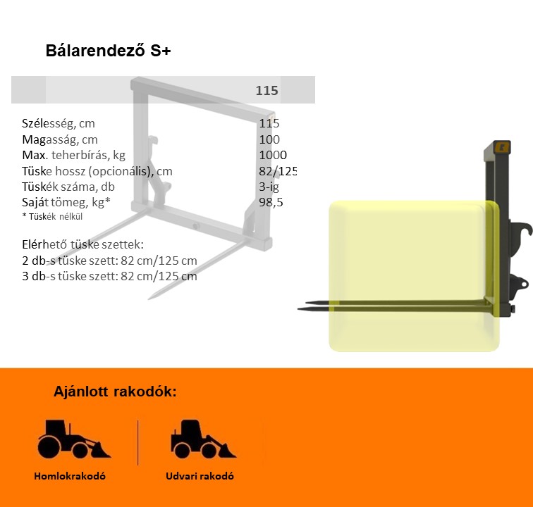 A Bálatüske S+ egyszerű, robusztus felépítésű, és a legelterjedtebb könnyű anyagmozgató gépek felfogatásaival kapható. A keret keskeny szélessége ideálissá teszi az udvari rakodógépekkel való használatra istállókon belül is. Akár három kovácsolt tüskével rendelhető, így a legnehezebb bálákat is fel tudja emelni.