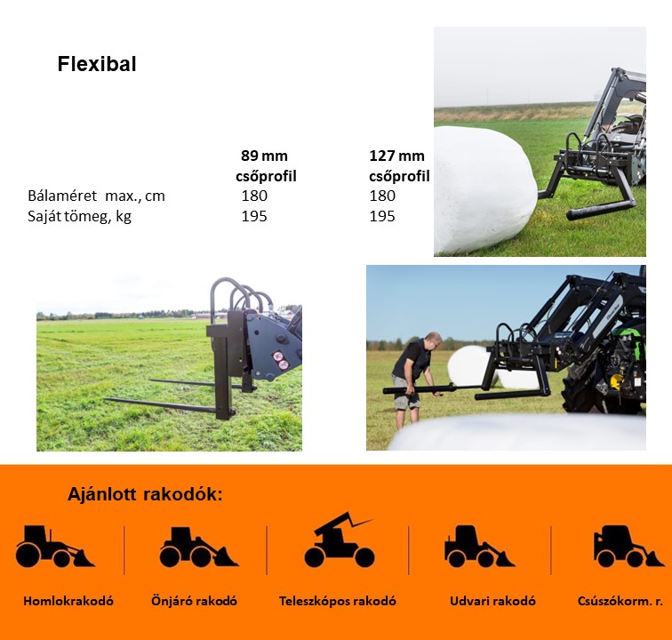 A Flexibal erős és nagyon rugalmas eszköz. A karok hidraulikus működtetésűek, a görgők a bála alatt gördülnek. Az acélcsövek a bála alatt gördülnek anélkül, hogy megsérülnének a bála mozgatásakor. A csövek nagy hosszúsága és átmérője egyenletesen osztja el a nyomást a bálán, így megakadályozza a műanyag csomagolás sérülését kezelés közben. Az acélcsövek gyorsan és egyszerűen eltávolíthatók szalma- vagy szénabálák szállítása során. A Flexibal 127 mm-es vagy 89 mm-es átmérőjű kivehető görgőkkel kapható, hogy megfeleljen ügyfeleink különböző igényeinek.