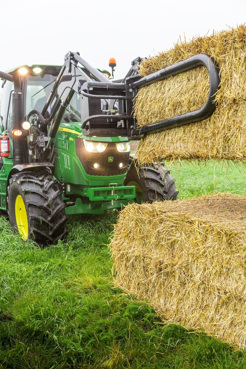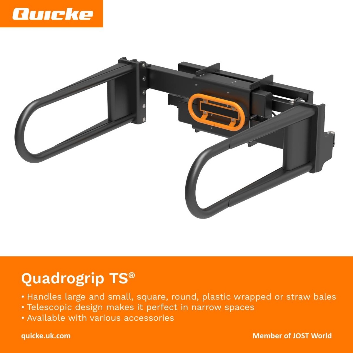 A Quadrogrip a piac legjobb eszköze szögletes és körbálák kezelésére. A munkagép karok 350 mm széles, rendkívül stabil csúszólapokra vannak felszerelve, amelyek a főváz mentén mozognak. A bal vagy a jobb kart is lezárhatja, és ez segít a halmozásnál. A csúszósínek szervizelhetők, kiváló minőségű polietilénből készülnek, és nem igényelnek kenést. A csúszó felületek függőlegesek, annak érdekében hogy megakadályozzák a szennyeződések letapadását. Az eredmény csökkentett súrlódás, halk mozgások, minimális kopás és hosszabb élettartam.