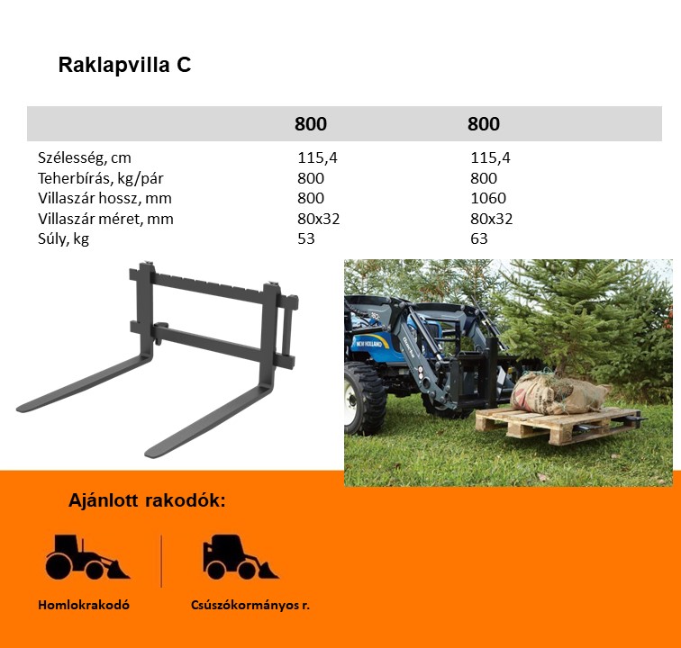 Kis tömegű, teherbírása kompakt traktorokra szerelt homlokrakodókhoz illesztett raklapvilla. Rendelhető Euro illetve csúszókormányos felfogatással.