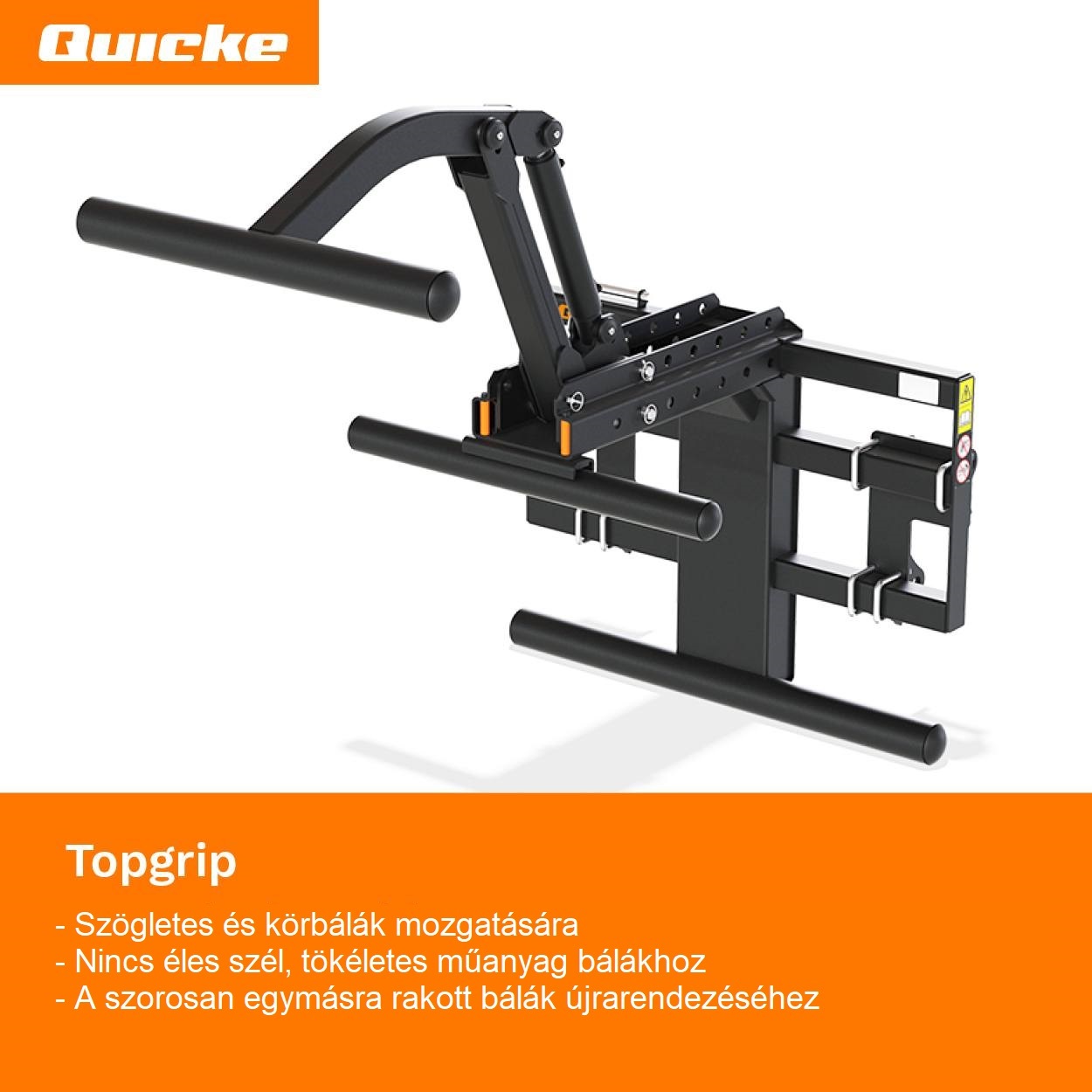 A Topgrip egyedülálló módszert kínál a kör- vagy szögletes bálák kezelésére. A kar a bála fölé nyúlik, és a hátulsó keret felé szorítja a bálát, hogy elhúzza a bálát a kötegtől. A kar a hidraulikus erő helyett a kar súlyával esik a bála mögé. Ez megakadályozza a bála hátsó részének sérülését. Ez egy egyedülálló művelet, amely tökéletes azoknak az ügyfeleknek, akik szorosan egymásra rakott, becsomagolt négyzet- vagy körbálákat kezelnek újra. A kar hegesztés nélkül lekerekített, hogy csökkentse az éles alkatrészeket, amelyek szétszakíthatják a műanyagot.